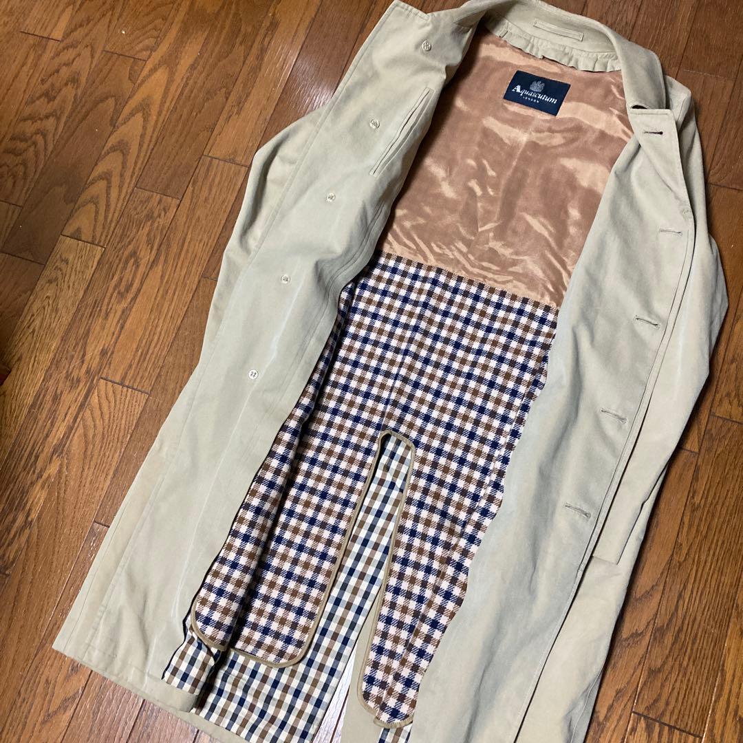英国老舗ブランド、アクアスキュータムです。メイドイン「イングランド」です。ライナーが付いてるので今の時期ちょうどいい分厚さです。ウールのライナーを外すことで、コットン素材のコートとしてより長いシーズンで着用いただけます。ライナーを外してもチェック柄の裏地が楽しめます。生地も分かりませんがソラーロ生地っぽくかなり高級感があります。