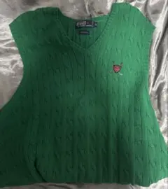 ケーブル編みデザインの赤いノースリーブニットベスト。
