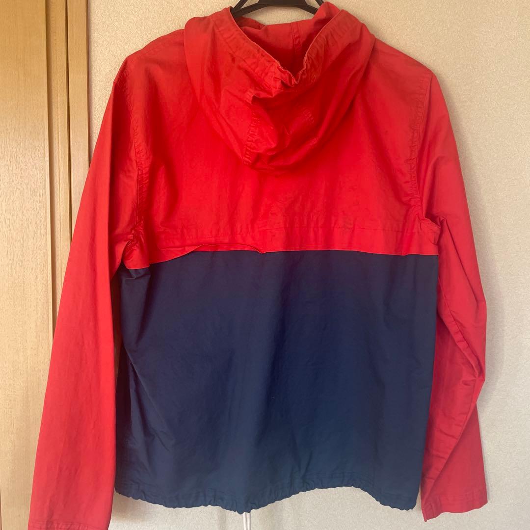 このジャケットは、赤と紺の2トーンデザインが特徴で、スタイリッシュな印象を与えます。フード付きのプルオーバータイプで、カジなコーディネートに最適です。