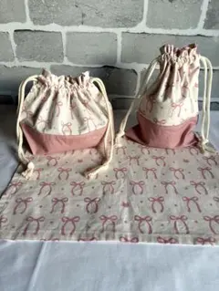 巾着袋は袋縫いでお作りしておりますので、端の処理が綺麗でほつれにくくなっております。裏地なしのため力の弱い小さな子でも扱いやすく、お洗濯後も乾きやすいかと思います。ランチクロスは一枚仕立ての額縁縫いでお作りしています。