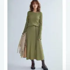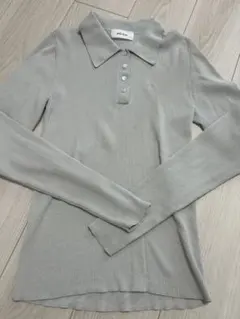 リブ編みの青い長袖トップス、快適な素材でスタイリッシュなデザイン。