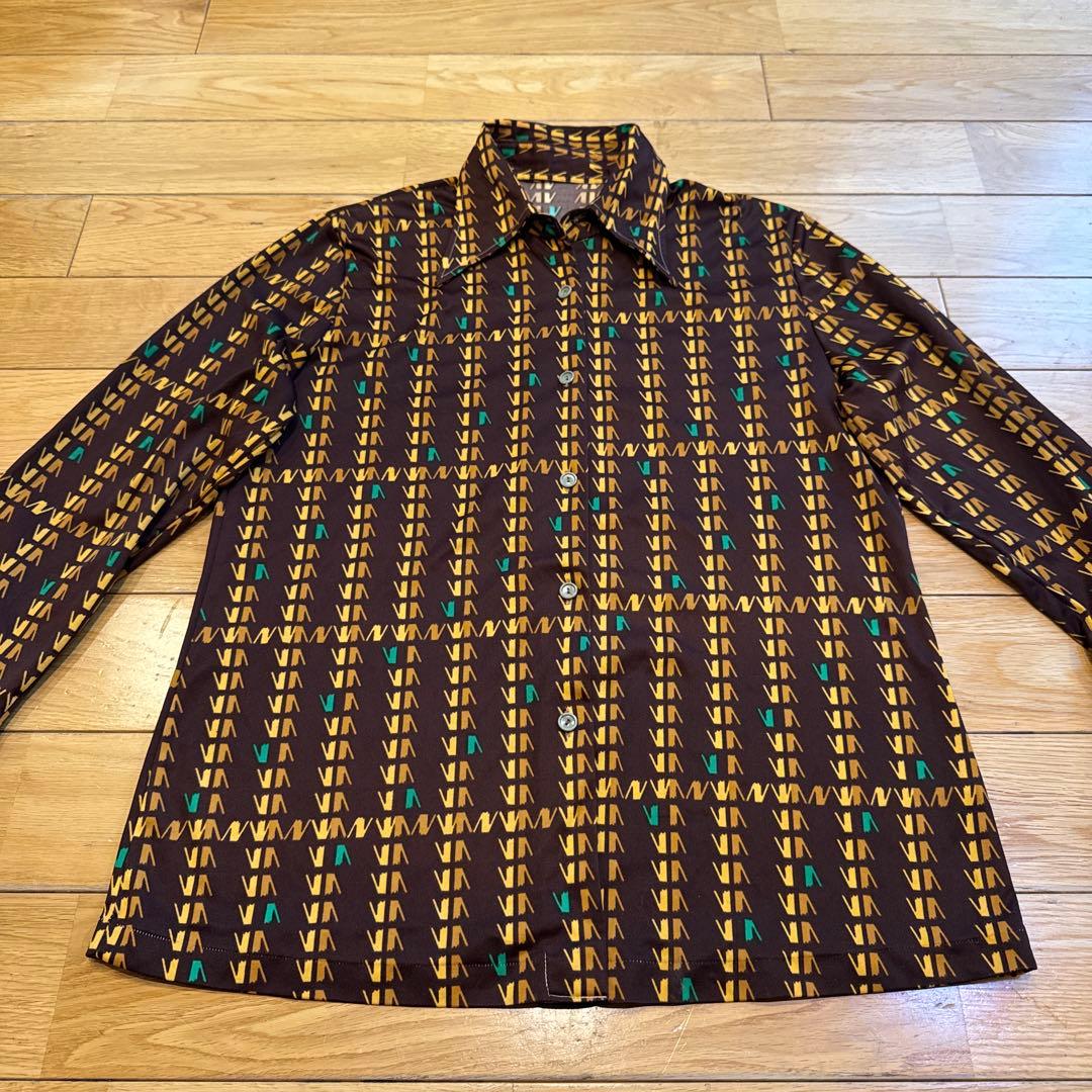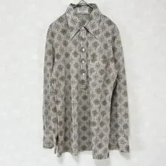 70sビンテージ!幾何学模様 長袖ポリエステルシャツ ブラウン