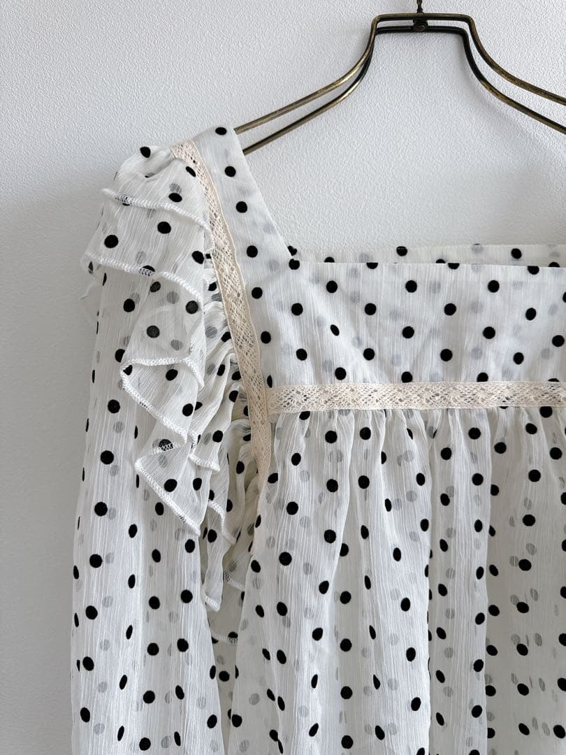 白地に黒の水玉模様、フリル付きの長袖チュニック。