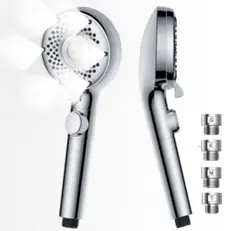 このマイクロナノバブルシャワーヘッドは、6種類の水流モードを提供します。直流モード:細かく広がる水流で、髪や体を徹底的に洗浄するのに最適です。マッサージモード:強力な水圧で肩や腰を効果的にリラックスさせます。直流+マッサージモード:強さと優しさを兼ね備え、体のほこりや汗を素早く洗い流します。美容スプレーモード:霧のような超微細気泡で、毛穴の汚れを優しく清潔にします。雨のようなモード:自然な雨粒を模して、心地よく柔らかい感触です。強力モード:強い水圧で、素早くシャワーを浴びるのに適しています。シャワーヘッドの側面にあるレバーを使って、モードを簡単に切り替え、最適なシャワー体験を見つけることができます。
