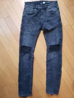 ダークブルーのスキニーデニム、ダメージ加工付きでスタイリッシュなデザイン。