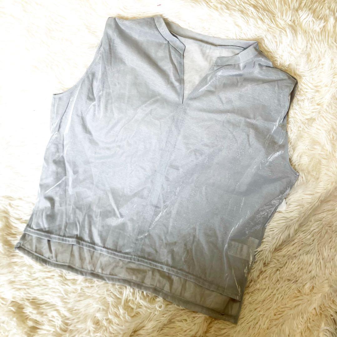 光沢感のあるシルバーのノースリーブ。Vネックデザインで、さりげなく素材がキラっとしていて可愛いです。