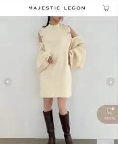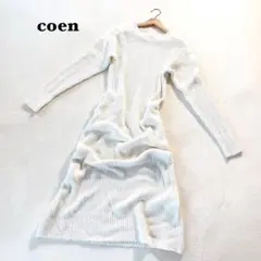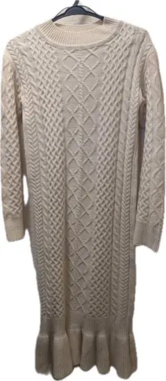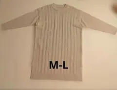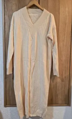 リブ編みニットの長袖ワンピース、グレーとアイボリーのストライプデザイン。