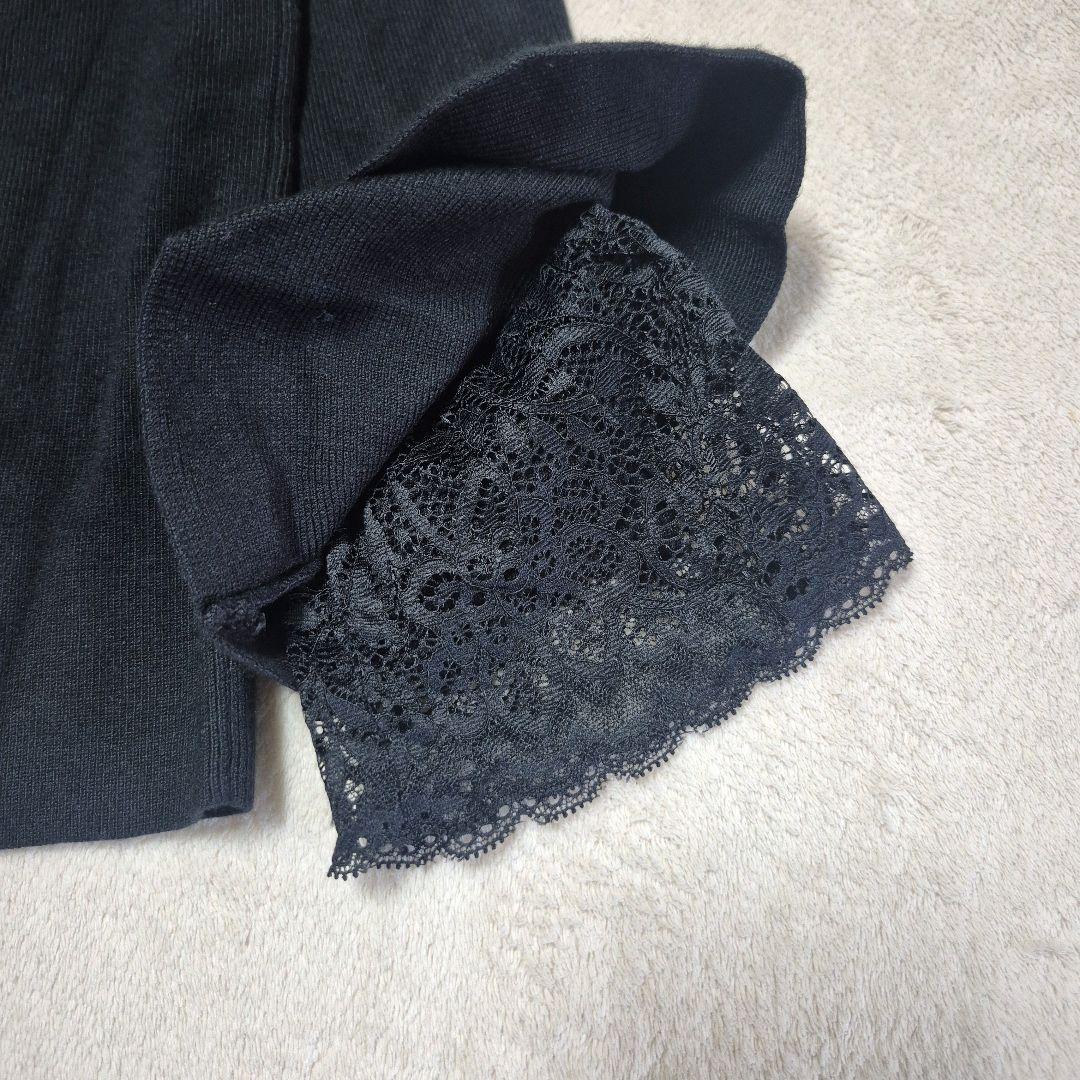 フレアスリーブとレースが特徴のブラックVネックニット。