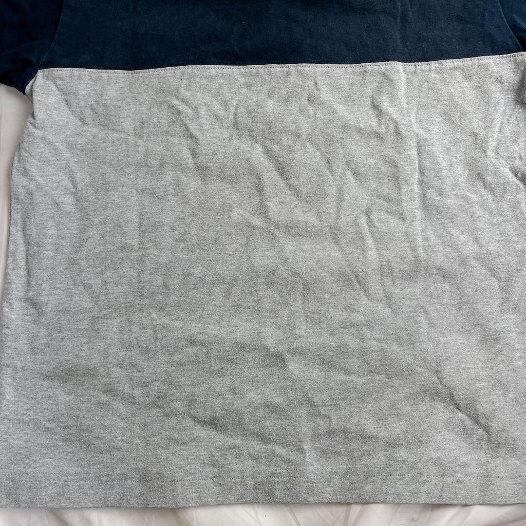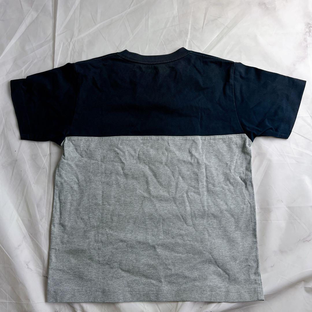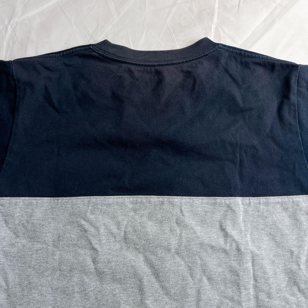 ネイビーとグレーの切り替えデザインに、胸ポケットのロゴタグがアクセントになっています。