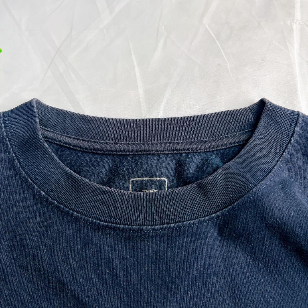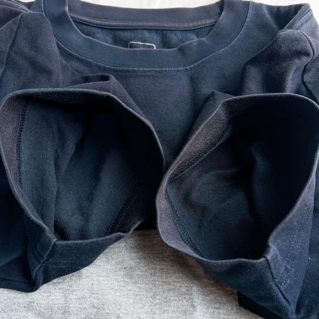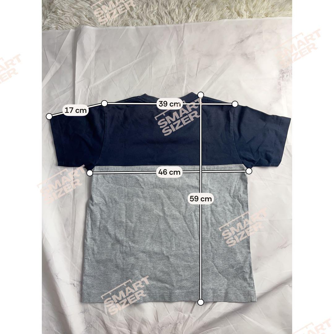 ネイビーとグレーの切り替えデザインに、胸ポケットのロゴタグがアクセントになっています。