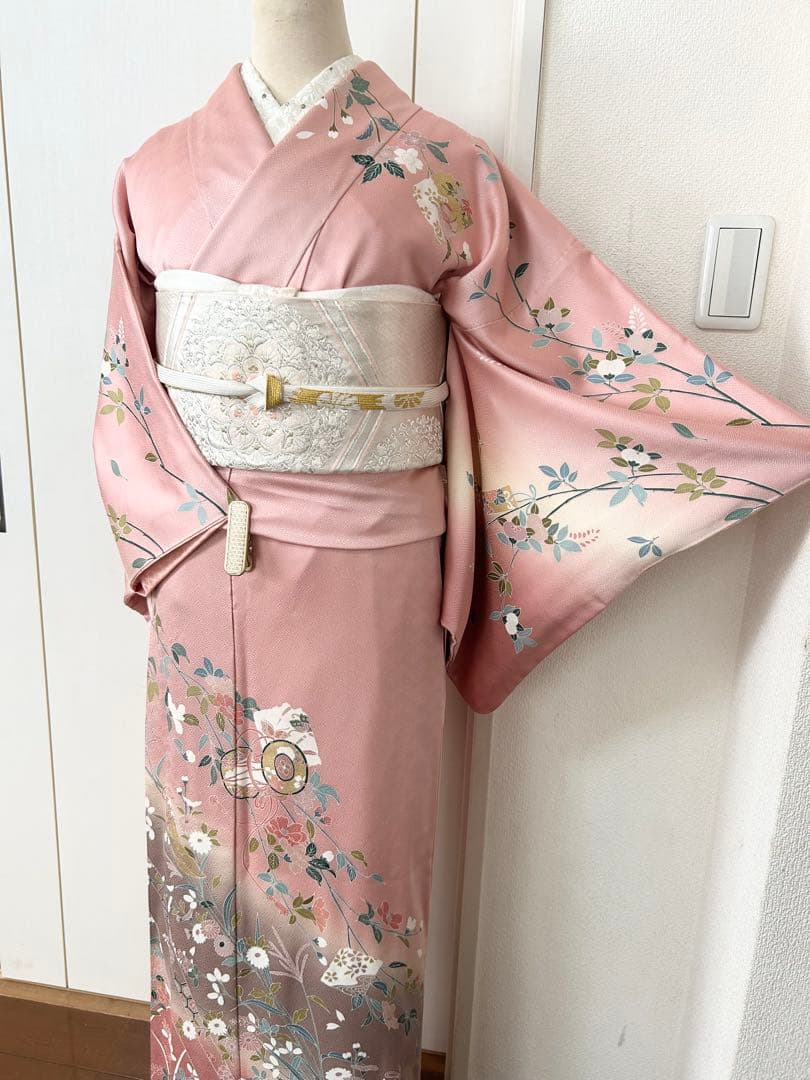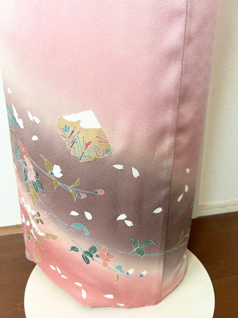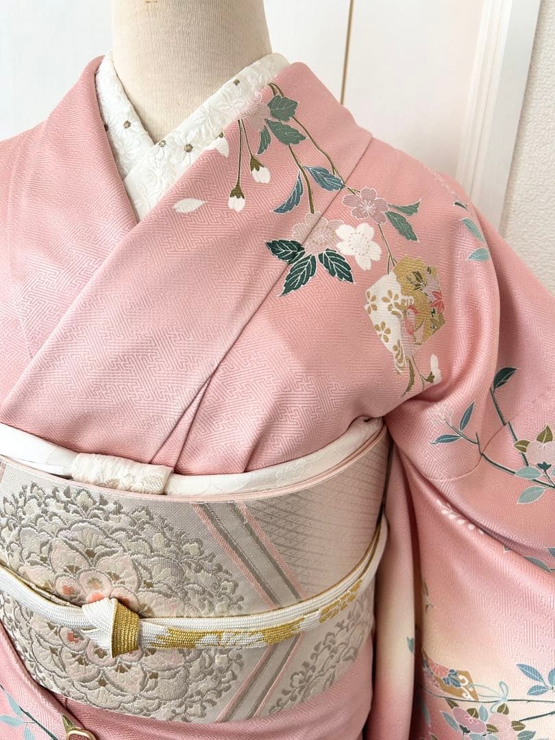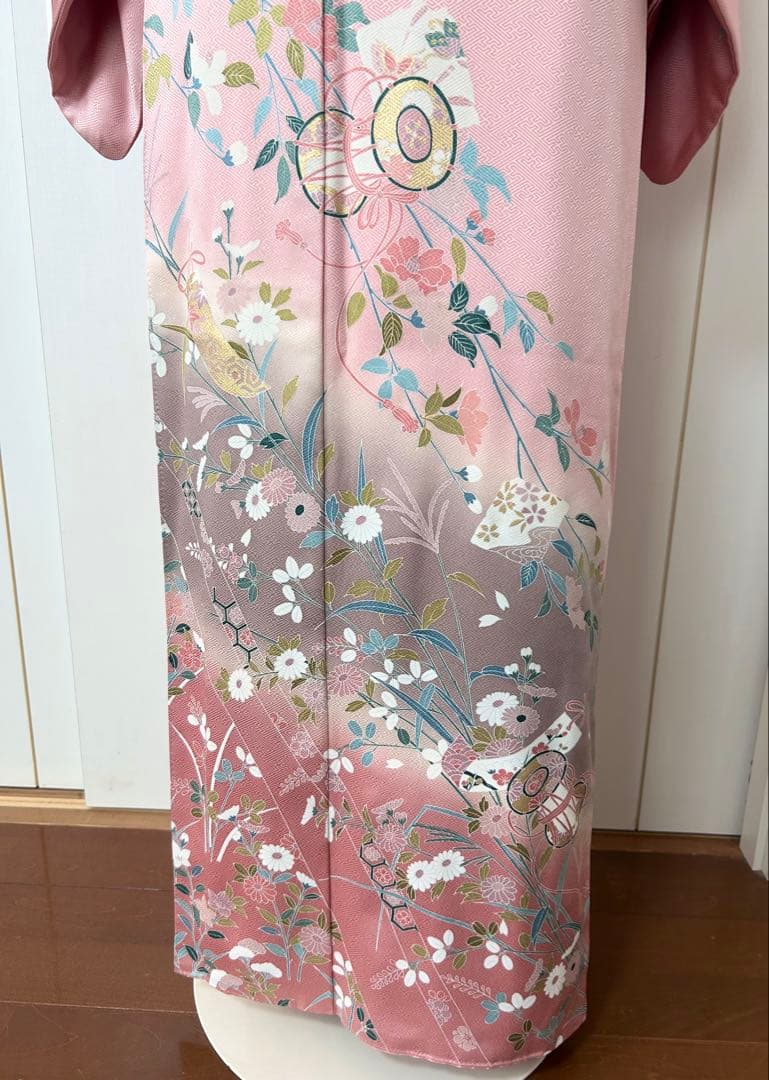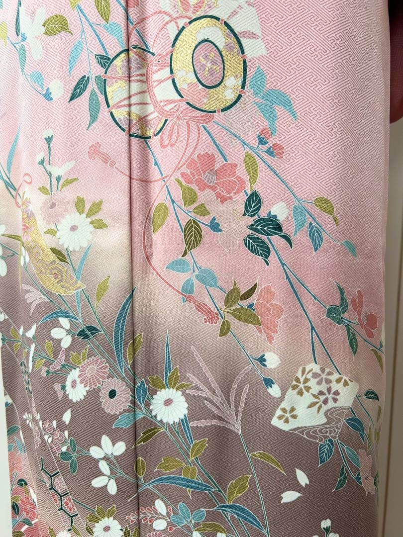 綺麗なピンク系のお色生地に、上前全体に鼓短冊花文様が描かれております。暈し染め、金彩がほどこされた華やかで上品な印象の正絹訪問です。