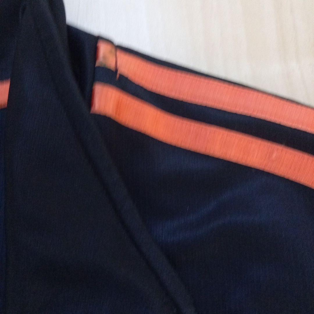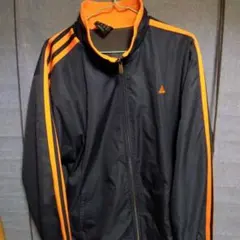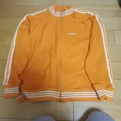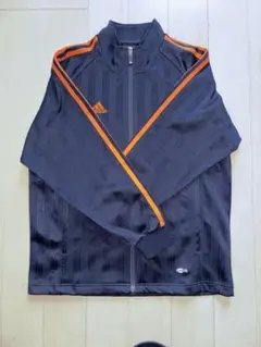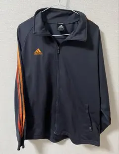 ネイビーとオレンジのストライプデザインのadidasジップアップジャケット。