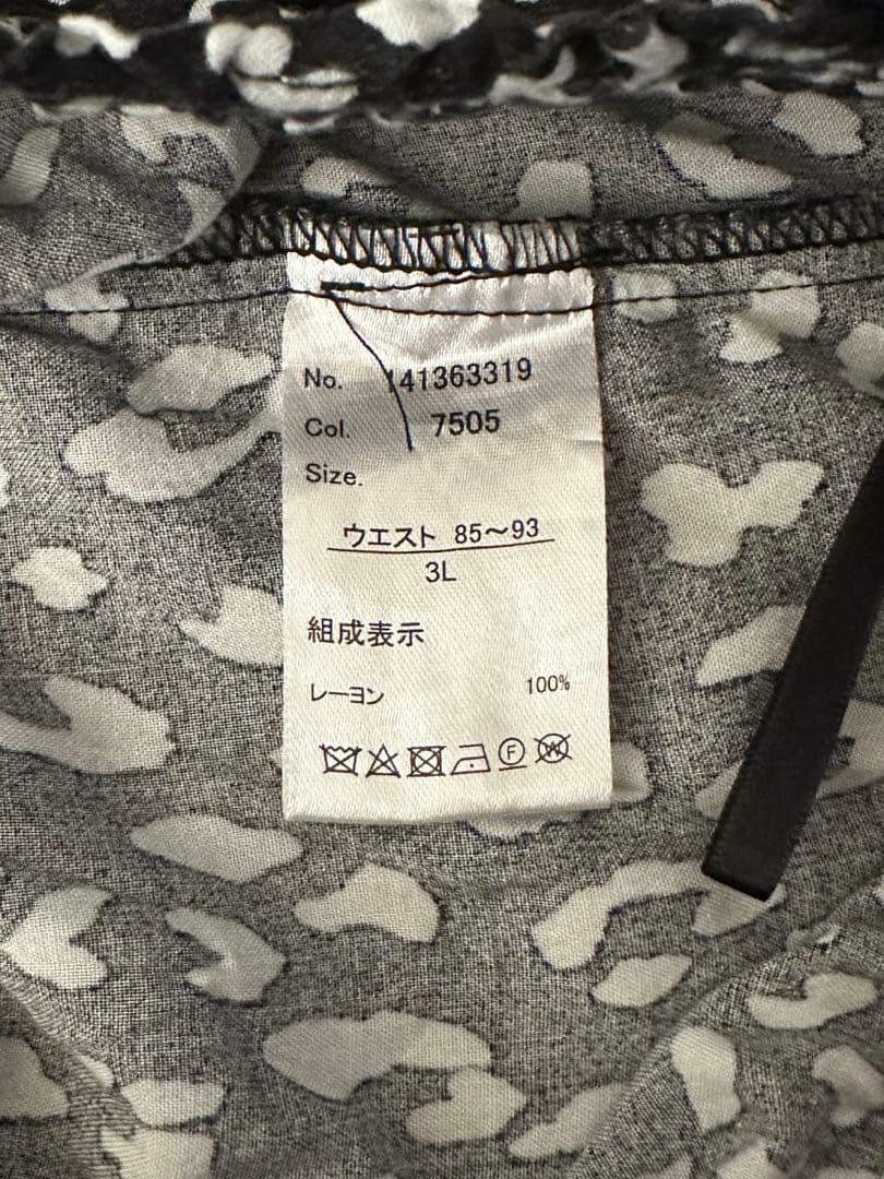 黒と白のレオパード(またはアニマル)柄のワイドパンツです。ゆったりとしたシルエットで、ウエストはゴム仕様なので楽に履いていただけます。
