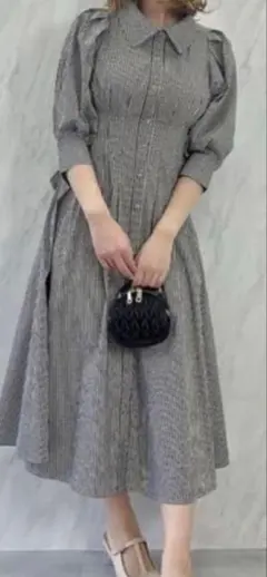 チェック柄のシャーリングデザインワンピース、ミディ丈で前面に飾りボタン付き。