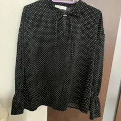 落ち着いたベージュに黒のドットと、肩の黒リボンが大人可愛い一着。オフィスカジュアルにもオススメ✨