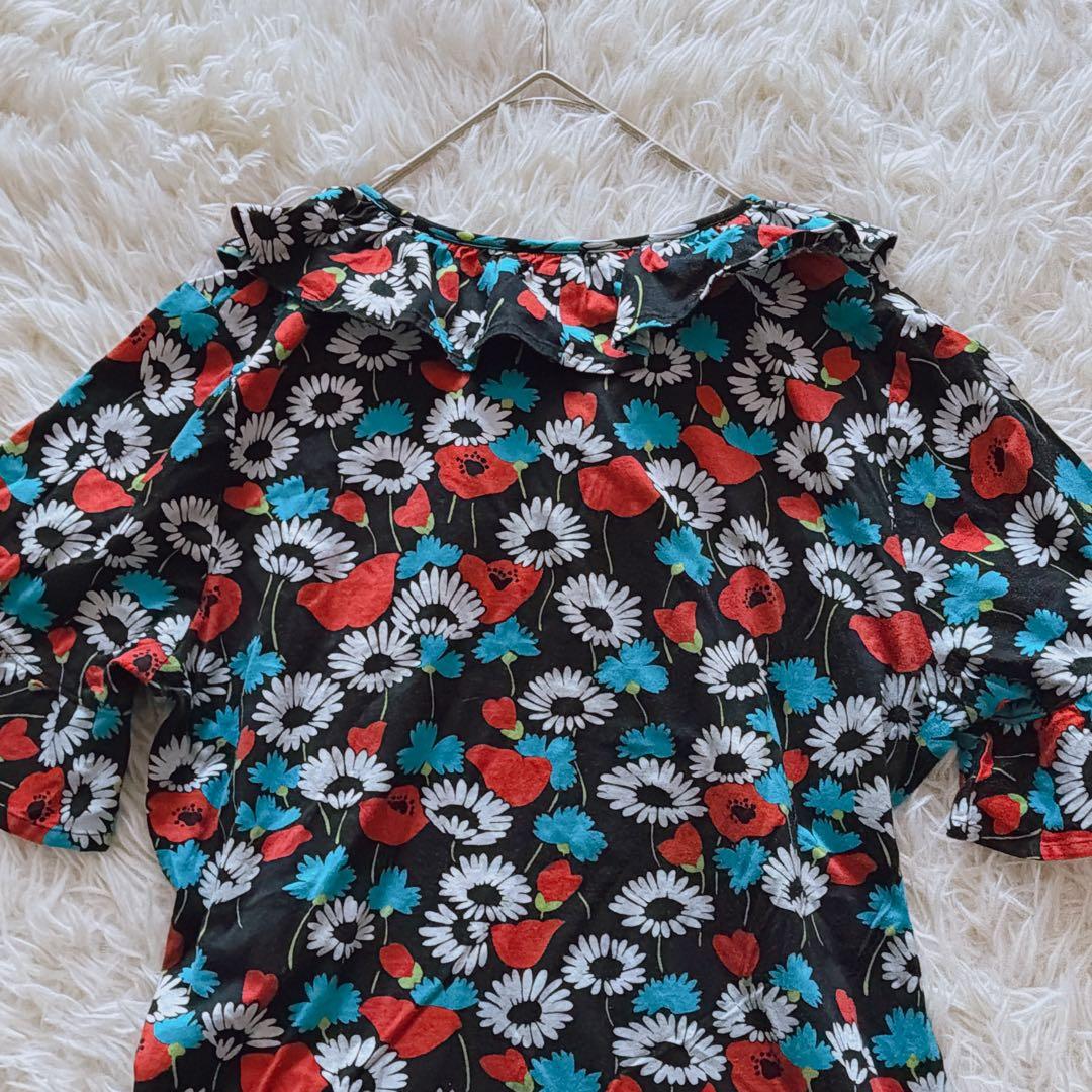ブラックベースにレッド・ブルー・ホワイトの花柄が映えるデザイン。