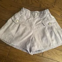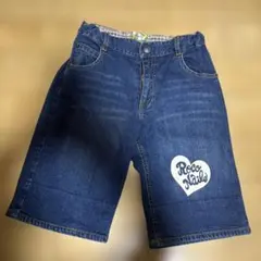 デニムブルーのストレートレッグパンツ、ハートと「Happy」のプリント、ストーン装飾付き。