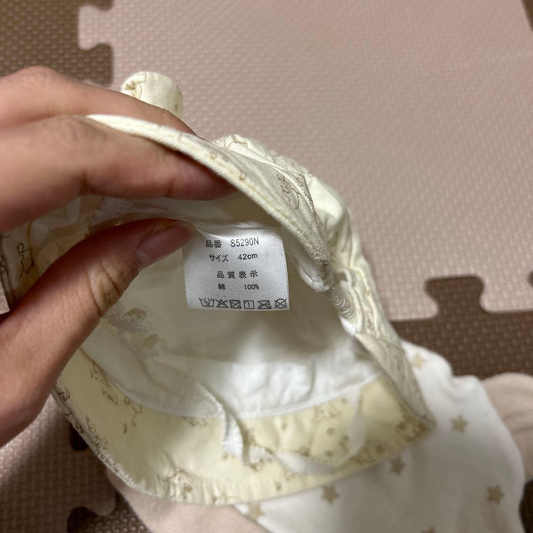 ホワイトの星マークのほうはタグがないため詳細分かりませんが、サイズは42センチ以上のお子様でも被れます(生地の伸縮性があるため)。