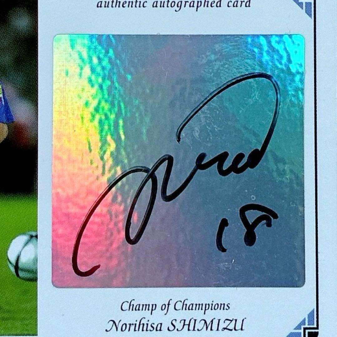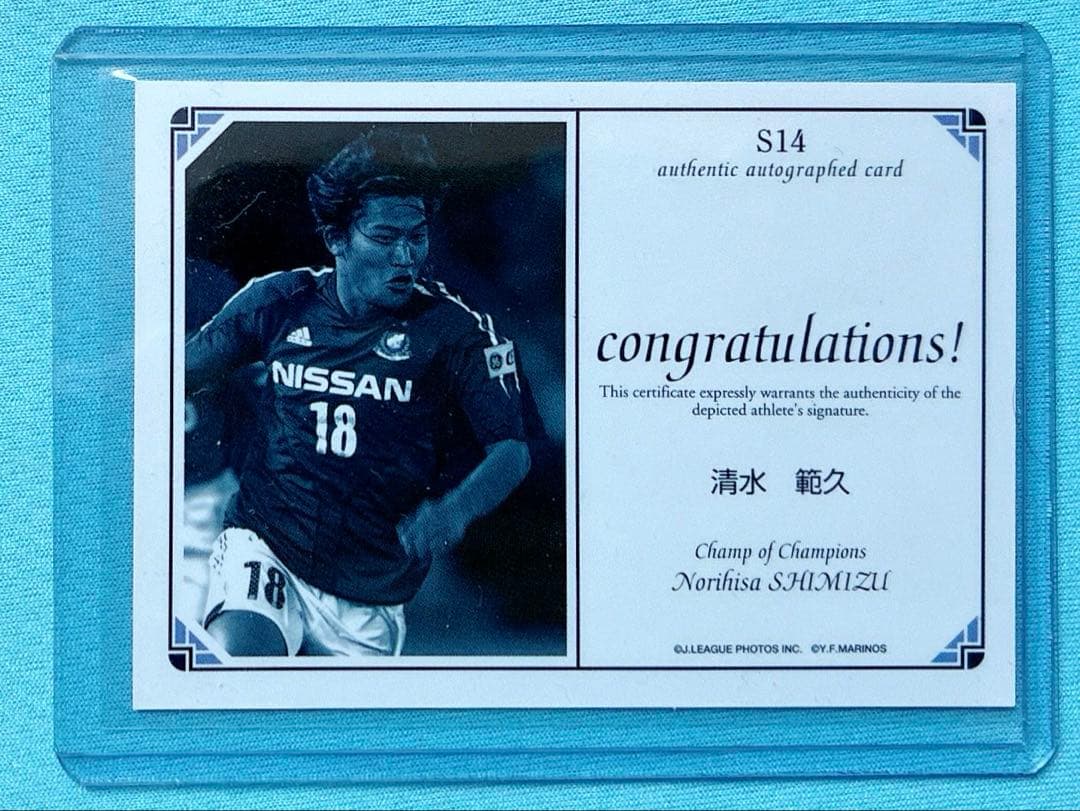 1990年代は同期入団の名波選手や福西選手等らと共にジュビロ磐田で活躍し、2000年代はストライカーとして長らく横浜Fマリノスを支えた清水範久選手の直筆サインカードです。