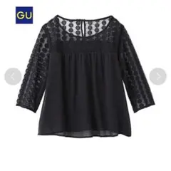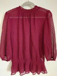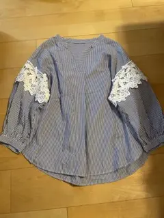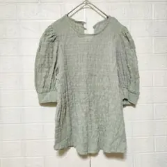 フラワープリントのグレーシャツ、フリル襟とバルーンスリーブが特徴。