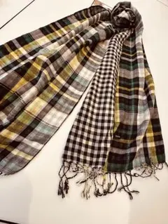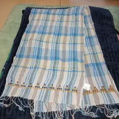 【未使用】ネイビーブロック春夏 シャーリングストール コットンメイン