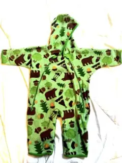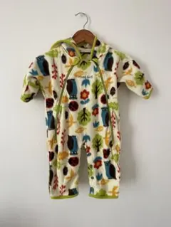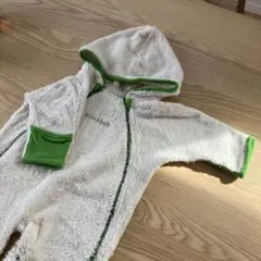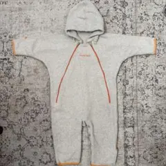 フリース素材のベビー用フード付きロンパースです。防寒着として活用しました。