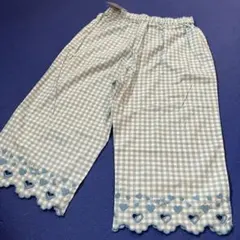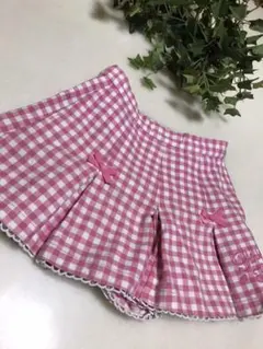 白と紺の爽やかなギンガム地に、はしごレースや紺のサテンリボンがかわいい、シャーリーテンプルらしいデザインのショートパンツ(キュロットスカート)です。