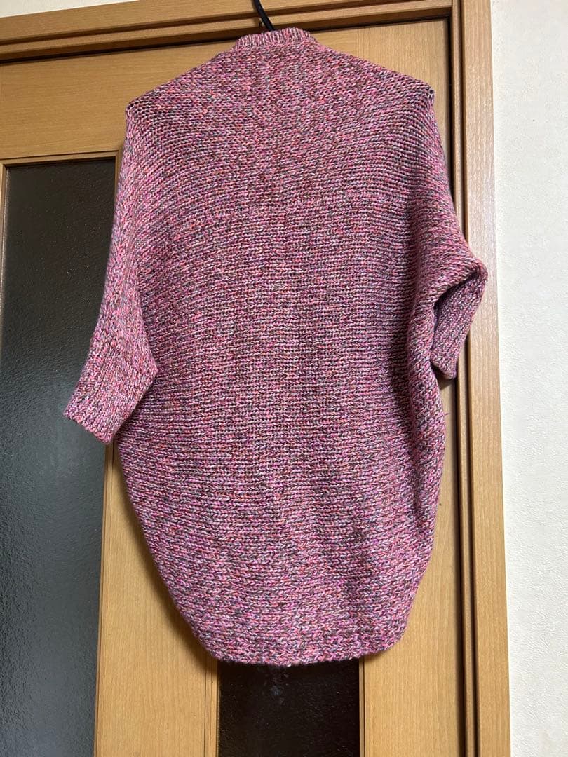 ピンク系のオープンフロントニットカーディガン、五分袖デザインが特徴。