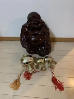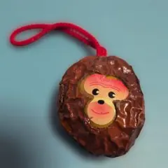 装飾的なオレンジ色の卵型置物、赤い紐とタッセル付き。卵と同じ大きさ。