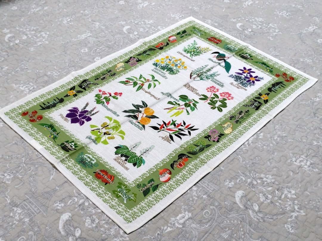 14種類の薬草のイラストが施されたテーブルセンター、テーブルクロスです。キッチンや食卓を華やかに演出します。1999年の日本新薬(株)の創立80周年記念のノベルティグッズです。