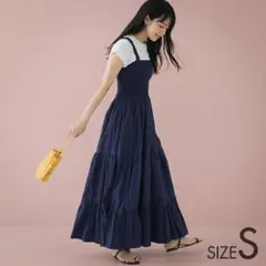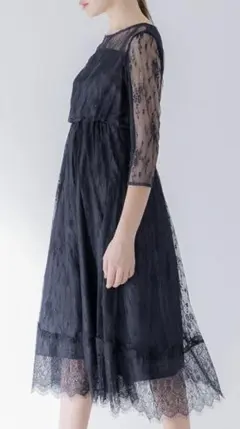深めのVネックと高めのウエスト切替で大人の女性が着やすい綺麗なシルエットが特徴。