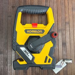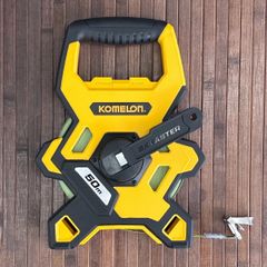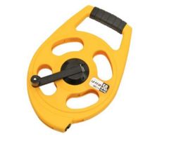 50mの鋼製巻尺(スチールメジャー)です。ハンドルを手動で回転させてテープを巻き取る仕組みです。長距離の測定に特化しており、建設現場、土木工事、測量、運動場のライン引きなど、高い耐久性と正確な測定が求められる場面で広く利用されています。