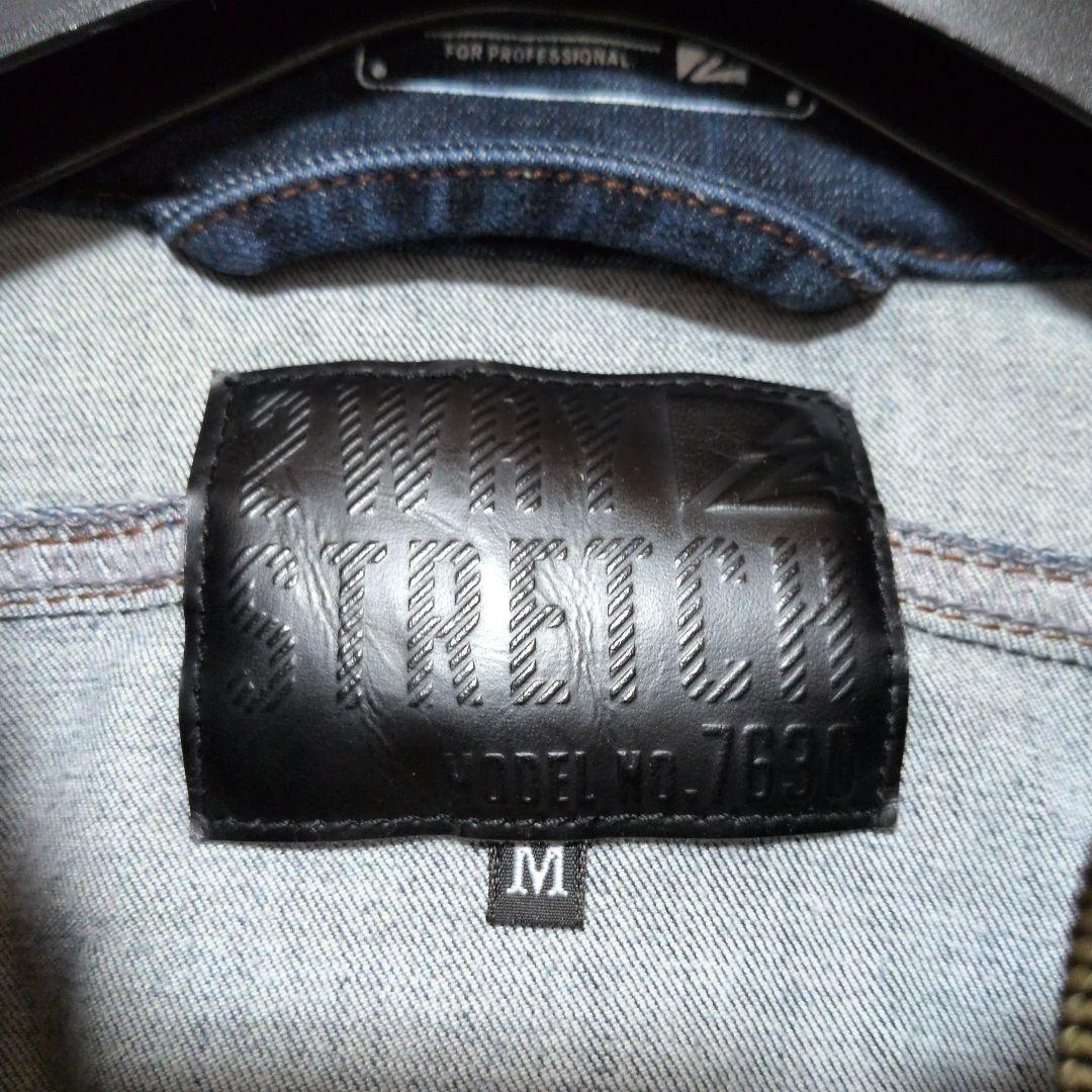 ストレッチデニム素材のダークブルーGジャン作業着、ジッパー付きポケット付き。