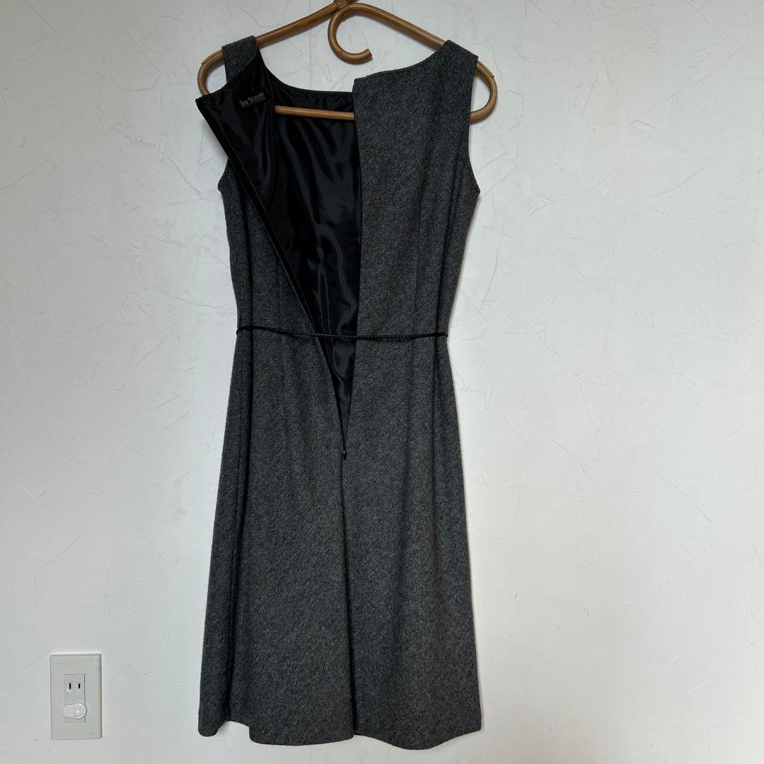 グレーのノースリーブひざ丈ワンピース、ウエストリボン付き、後ろジッパー付き