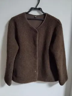 ベージュのノーカラージャケット、長袖、ポケット付きでスタイリッシュなデザイン。