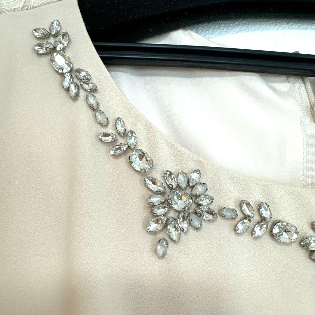 胸元にキラキラがついていて、腕は花柄のレースになっています。