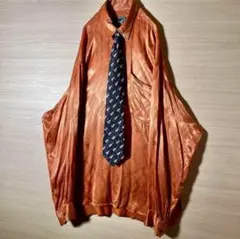 合わせたのは、イタリア製シルクのネクタイ。抽象的なパターンを思わせるダークトーンのデザインで、ストライプシャツに自然と馴染みつつ、コーデ全体を引き締めてくれる一本。きれいめにもレトロ寄りにも振れる、完成度の高いシャツ×ネクタイのセットです。