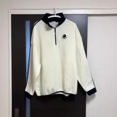 ハーフジップデザインのブラックフリーススウェット、刺繍ロゴ付き。