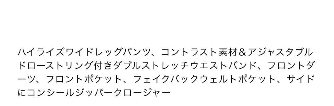 ハイライズワイドレッグパンツ、コントラスト素材&アジャスタブルドローストリング付きダブルストレッチウエストバンド、フロントダーツ、フロントポケット、サイドにコンシールジッパークロージャー