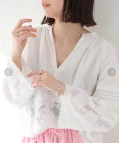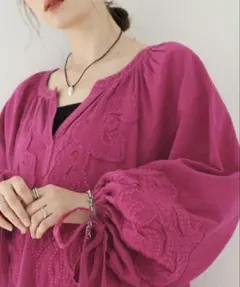 たっぷりとギャザーを寄せた、今年らしさ満点のボリュームスリーブがフェミニンなブラウス。胸元にはすっきり細見えするようなバランスで、細やかな刺しゅうをあしらいました。袖やカフス部分にもさりげなく刺しゅうを飾り可愛らしいアクセントに。