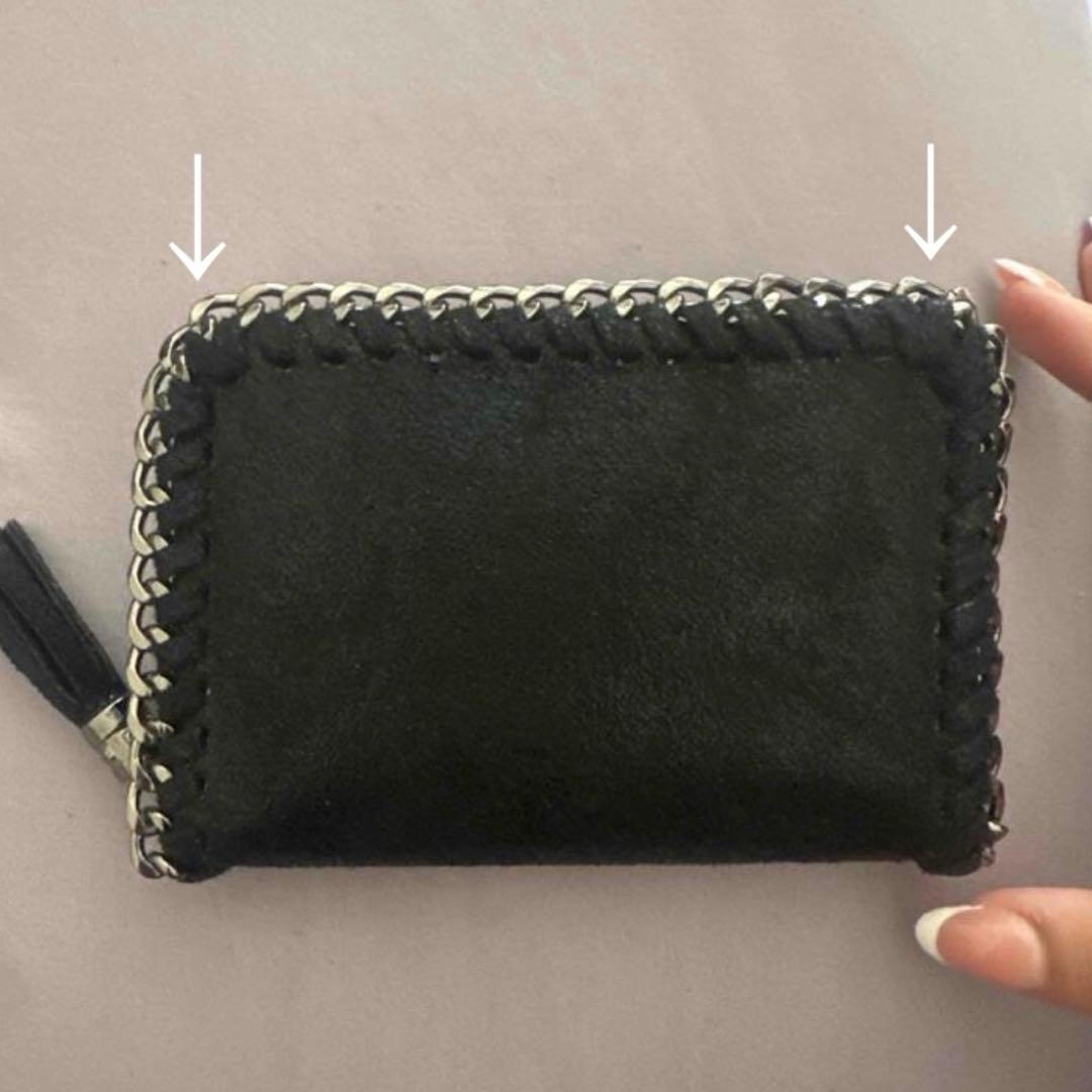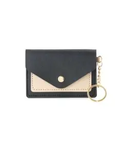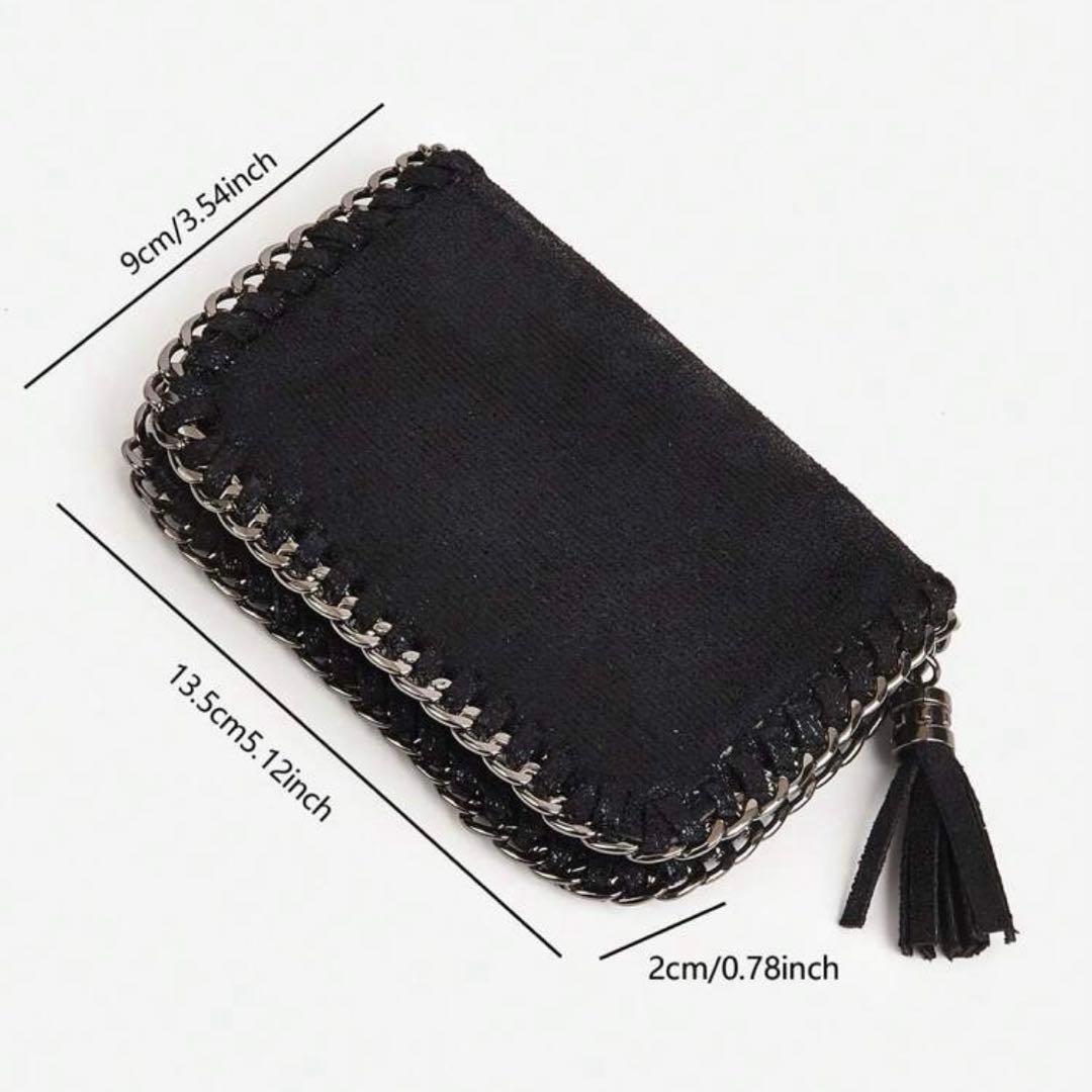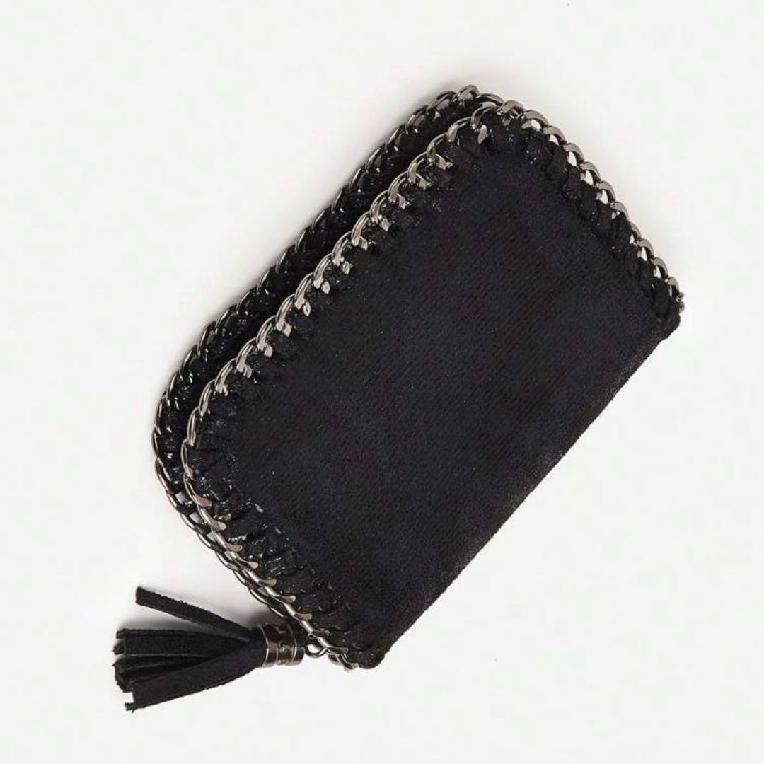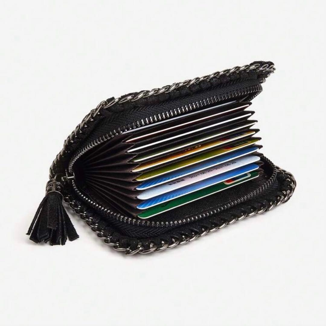 ファスナー付きの黒いカードケース、タッセル付きでスタイリッシュ。