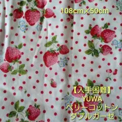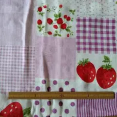 いちごとチェック柄のガーゼ生地、可愛らしいデザインで手芸に最適です。