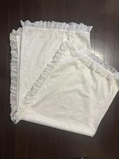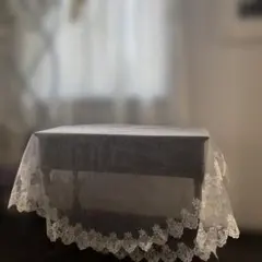 光沢のある生地に花模様のレースエッジが施されたハンドメイドのテーブルクロスです。
