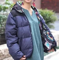 カラフルなエスニックデザインのダウンジャケット、フード付きで暖かさを提供。