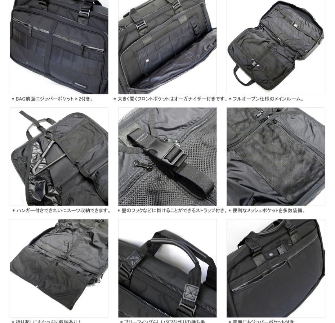 デイリーにも出張にも使えるガーメントバッグです! 一般的なガーメントバッグとは違い、ガーメントをたたんだ時のルックスが 少し大きめのビジネスバッグに見えるのがポイント! メインルームはフルオープン仕様。 スーツがきれいに収納できるガーメント部は 多数のジッパーポケット、メッシュポケットを搭載。 スーツ以外のシャツやネクタイなども分けて収納できます。 壁などのフックに掛けて使用できるストラップも装備されているので、 宿泊先等でスーツがシワになる心配もありません。 また、フロントにはジッパーポケット×2を完備。 大きく開くオーガナイザー付きポケットもあります。 2WAYで使える取り外し可能なショルダーストラップ付き。 バッグ背面のバックルを使えば、スーツケースとの連結が可能です! また、メイン素材には強度や軽さ、対ショック性、素材自体の張りなどを兼ね備える バリスティックナイロン+ウレタンフォーム+ブラッシュナイロンを張り合わせた3レイヤー素材を採用。