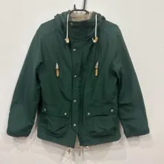 グリーンのフード付きマウンテンパーカー、ボアインナー付きで保温性抜群。