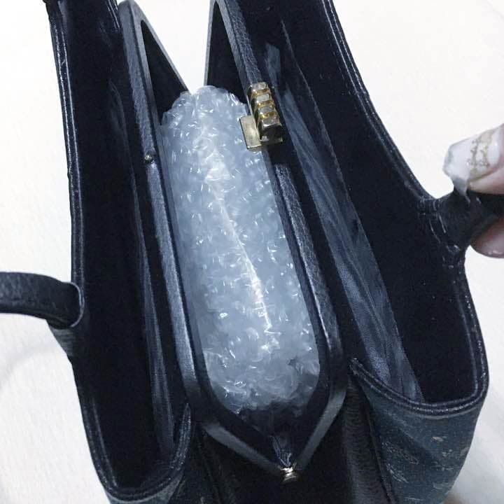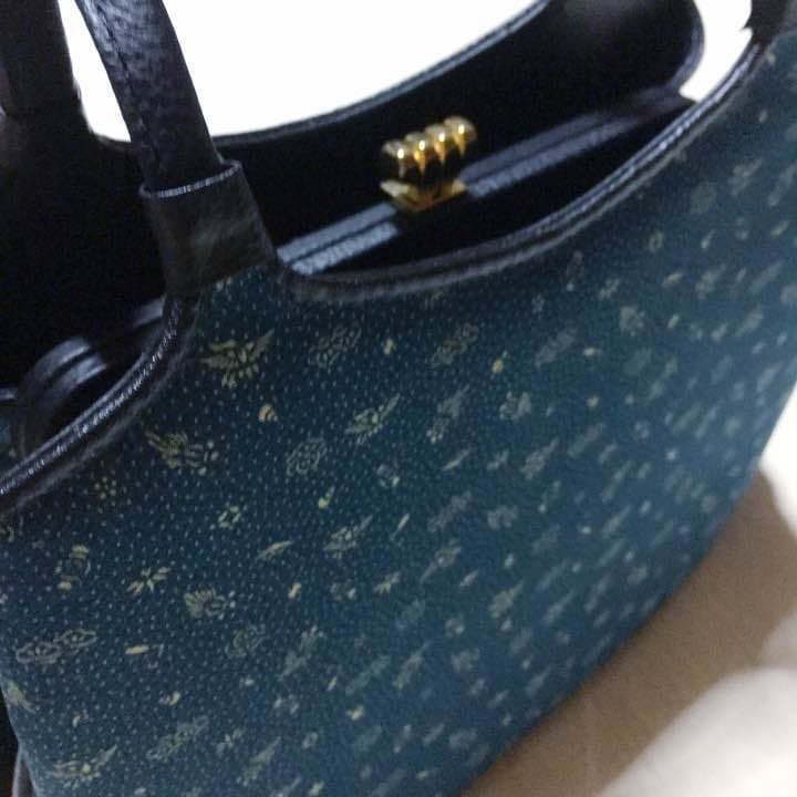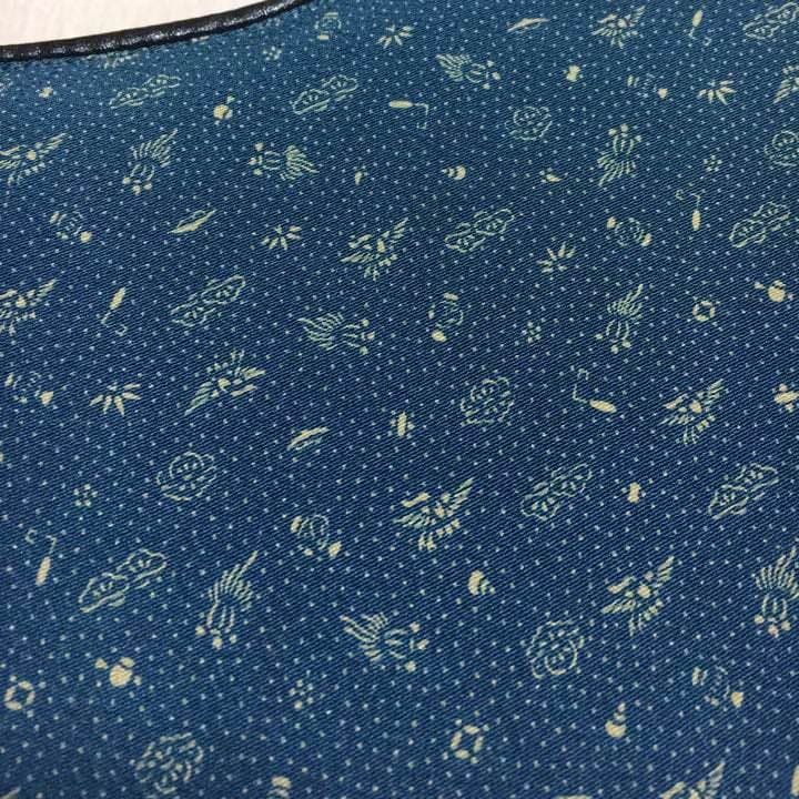 可愛らしい絵柄の正絹の縮緬とサイド持ち手は皮を使用