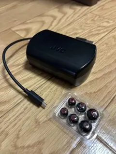 ホワイトのJVC製ワイヤレスイヤホン、充電ケース付きで便利。