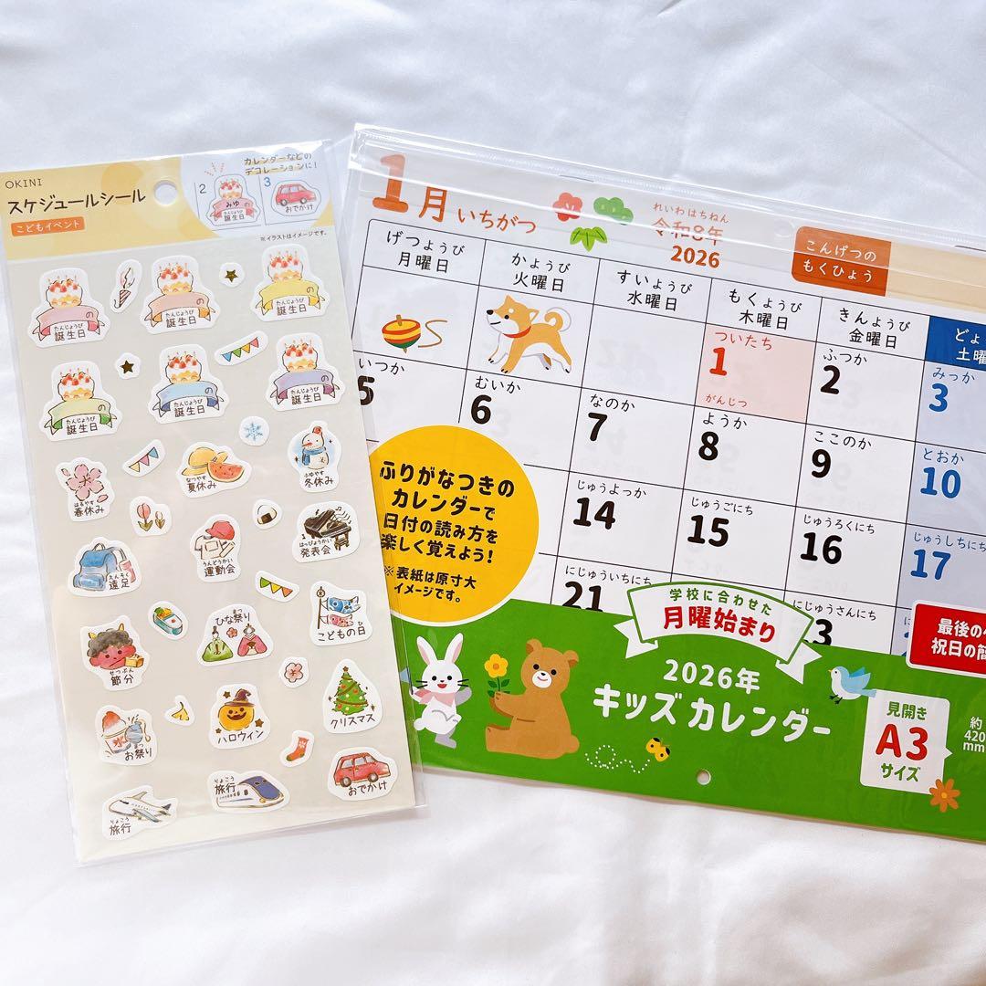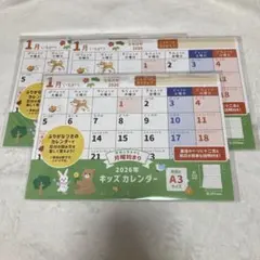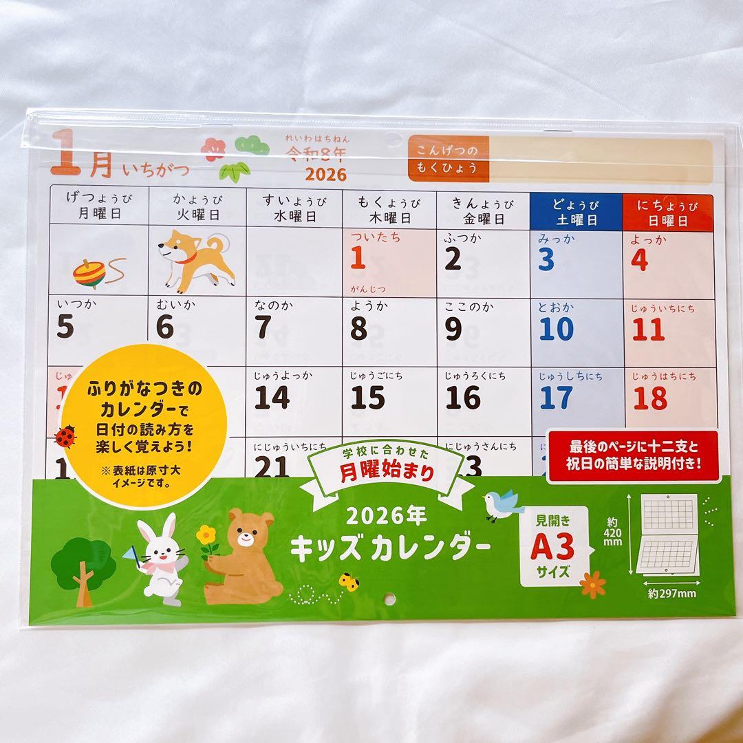 2026年のA3サイズの子供向けカレンダー、月曜始まりで可愛い動物イラスト付き。