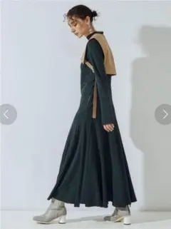 深く前下がりをつけそこに共布のコードを編み上げたマキシワンピース。